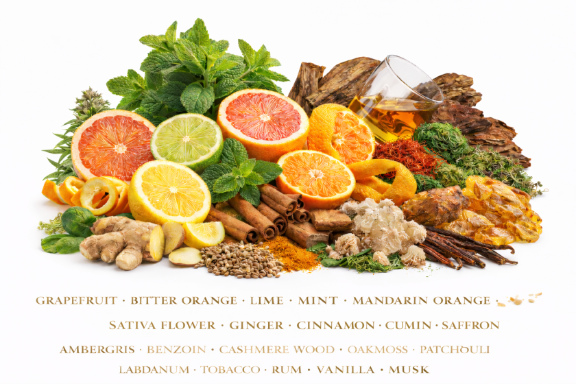 head notes: grapefruit | lime | mandarin | bitter orange | mint heart notes: sativa flower | mint | rum | casmir wood base notes: ginger | cinnamon | cumin | saffron | patchouli | oakmoss | tobacco | cedarwood | benzoin | vanilla | labdanum | ambergris | musk